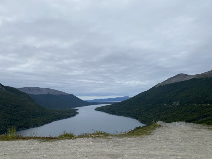 A wide river, its waters reflecting the cloudy sky, flows between wooded hills. The slopes are densely vegetated in dark green, contrasted by patches of bare rock on their upper reaches. A slightly elevated, sandy foreground hints at the viewing point. The atmosphere is muted, dominated by overcast skies and a somber color palette. Distant mountains can be seen where the river fades into the horizon.