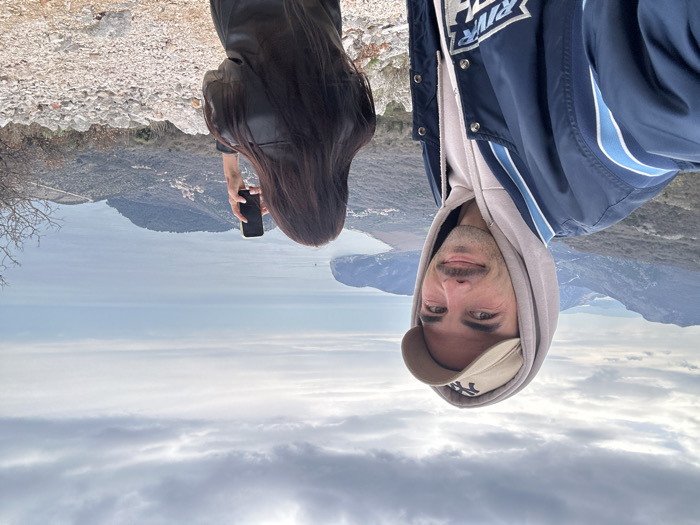 A male subject, approximately 20-35 years old, with short dark hair, a mustache, and a short beard, is positioned in the foreground, facing the camera and exhibiting a slight smile. He wears a beige baseball cap (with a dark 'NY' logo), a light beige hooded sweatshirt, and a dark blue varsity jacket with light blue and white stripes on the sleeves and a partial white logo ("RIVR") on the left chest. To his right and slightly behind, a female subject with long, dark hair, seen from the back, is holding a dark smartphone horizontally with both hands, pointing it towards the distant landscape. The scene is an elevated outdoor viewpoint in Novoselje, Montenegro. The immediate ground consists of light-colored, rocky terrain with sparse, dry vegetation. Beyond the subjects, a panoramic view unfolds under an overcast sky featuring layers of grey and white clouds. The vista includes a large body of calm, grey-blue water (sea), a curving coastline with a beach and a small coastal settlement nestled among the hills. Mountains and hills, covered in sparse, dry vegetation, recede into the distance, framing the bay and sea. A distinct landmass is visible across the water on the horizon.