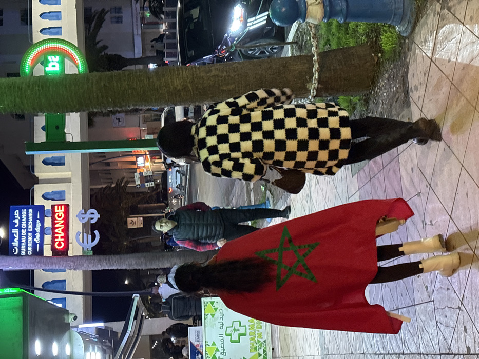 A street scene at night in what appears to be Morocco. A woman wears a Moroccan flag as a cape. Another person wears a checkered coat. A sign indicates a pharmacy and a currency exchange bureau. There is a column with a tree wrapped around it, and lights and a car in the background. The image is rotated.