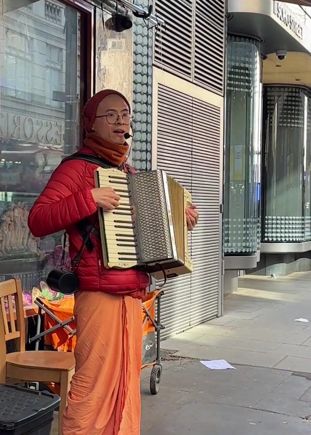 - "A person dressed in an orange robe and a red jacket is standing on a sidewalk and playing an accordion" by FM-n6yWE2, licensed under CC BY 4.0