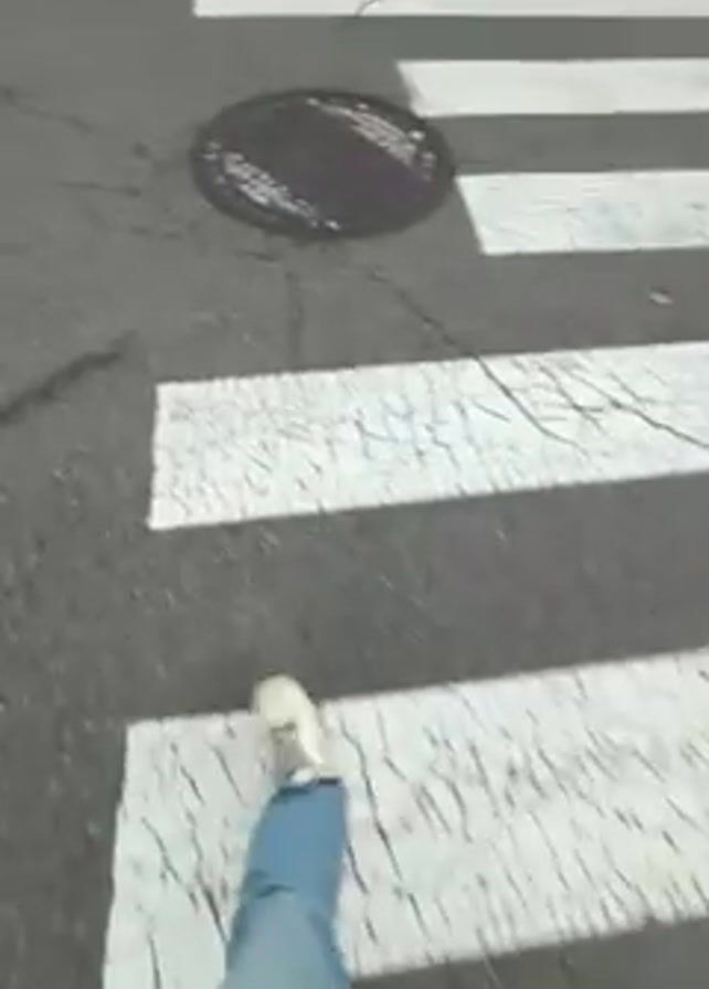 person crossing a street on a pedestrian crosswalk, from a first-person point of view