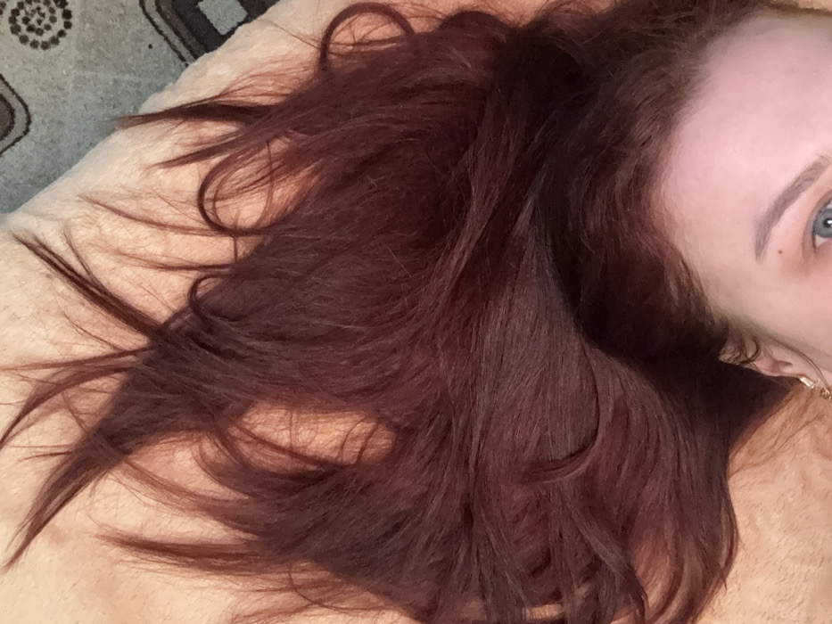 A woman with red-brown hair rests on a soft, yellow surface. Her hair is spread out, showcasing various textures and tones. A portion of her face is visible, including a blue eye and eyebrow. A small piece of jewelry is visible near her ear. The background includes a textured, patterned rug or fabric.