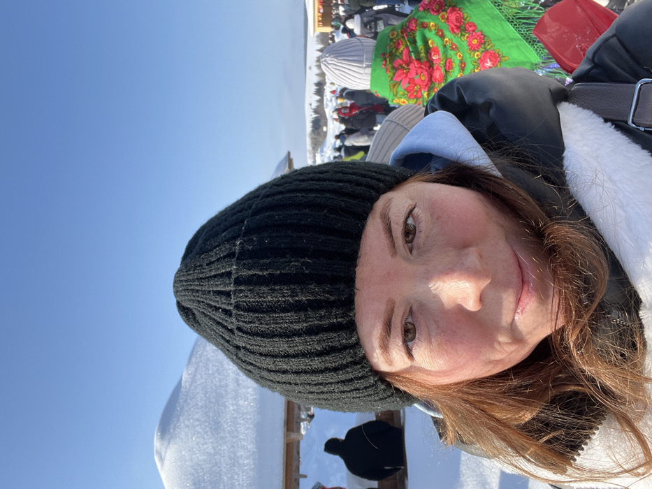 The image captures a female individual in a selfie-style composition during a clear, sunny winter day in Ludorvay, Russia. The subject, a woman with reddish-brown hair and a slight smile, wears a black ribbed knit beanie and a black puffer jacket with a white fleece lining over a light blue hoodie. Her face appears flushed. In the background to her left, a large, snow-covered dome-like structure is visible, along with a dark-clothed individual seated or stooping in the snow. To her right, a crowd of people is present; one person in the midground wears a light-colored beanie and a bright green shawl adorned with a red and pink floral pattern, with a red object partially visible nearby. The extensive environment is covered in snow, and the distant horizon shows snow-covered trees and subtle structures under a clear blue sky.