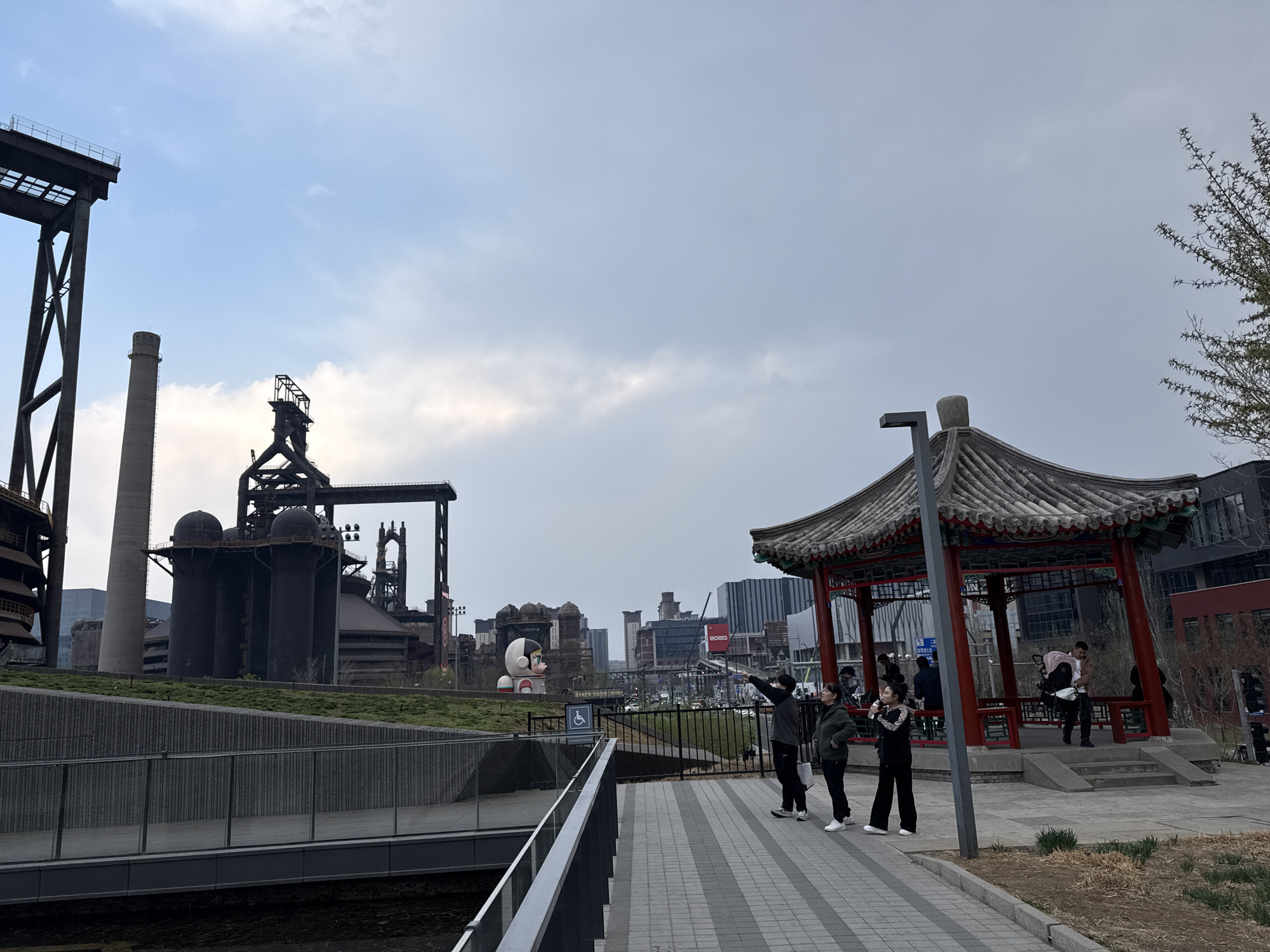 view in Shijingshan District, China. In the background stands a large, decommissioned industrial complex featuring a tall smokestack and metallic structures. In the foreground, a group of three people is gathered on a paved pathway near a traditional Chinese pavilion with red pillars and a tiled roof. One person in the group is pointing towards the industrial complex. The overall scene depicts a blend of industrial heritage and public park space in an urban environment. A small accessible access symbol is on the side of the pathway.