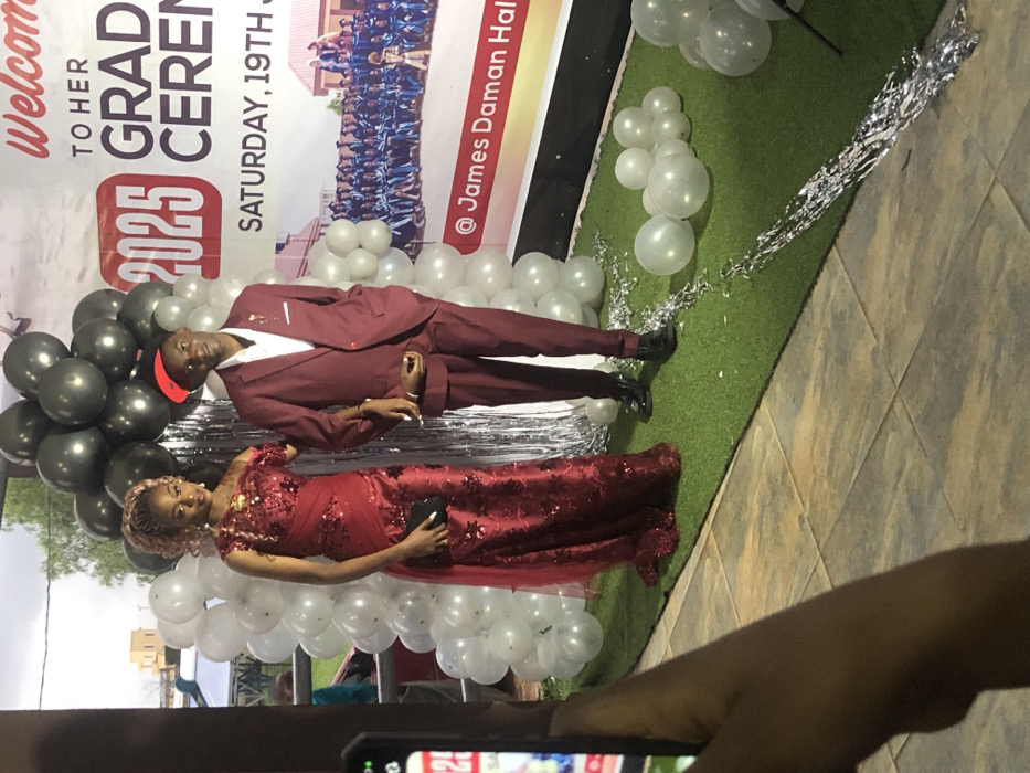 The image depicts an outdoor or semi-outdoor formal event in Bar Gada, Nigeria, specifically at James Daman Hall. Two individuals, a female and a male, are centrally positioned, posing for a photograph. The female subject, on the left, is a young adult with dark skin and light-colored braided hair. She wears an off-the-shoulder, dark red gown adorned with sequin-like embellishments and a sheer overlay. She has gold-colored jewelry, including earrings and a necklace, and holds a black clutch bag in her left hand. Her right arm is linked with the male subject's left arm. The male subject, on the right, is a young adult with dark skin. He wears a dark red suit over a white collared shirt, a red baseball cap worn backward, and black dress shoes. A small white lapel pin is visible on his blazer. His right hand is in his pocket, and his left arm is linked with the female subject's right arm. Both individuals are looking towards the camera. Behind the subjects is a large white banner serving as a backdrop. Text on the banner includes "Welcome TO HER", "2025", "GRAD CEREM", "SATURDAY, 19TH J", and "@ James Daman Hall". An image of a group in blue graduation gowns is visible on the lower right portion of the banner. The backdrop is framed by balloon arches consisting of black and white balloons, with silver tinsel streamers. Additional white balloons and scattered silver tinsel are present on the artificial green turf where the subjects are standing. In the immediate foreground, on the left, a person's arm and hand are visible holding a black smartphone, capturing the scene. The phone's screen displays partial text, including "2025" and "SA". The ground in the foreground is a patterned tiled surface. The background beyond the event setup is out of focus, showing indistinct structures and an overcast sky.