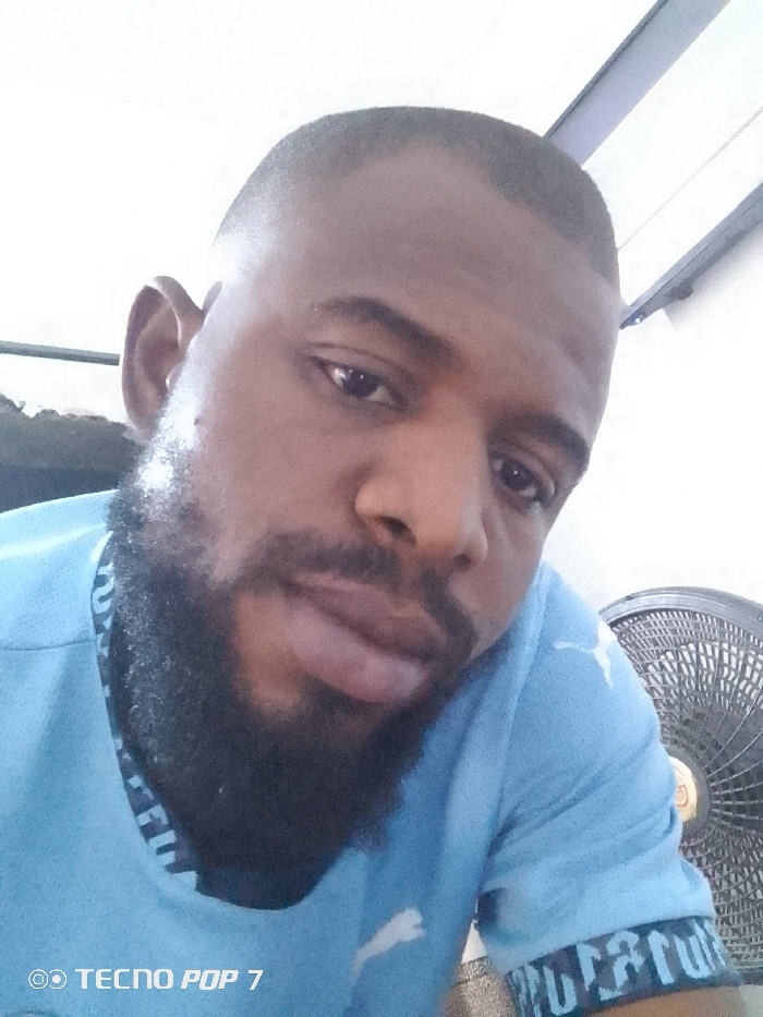 A close-up selfie features a Black man with a neatly trimmed, short haircut and a thick, well-groomed beard