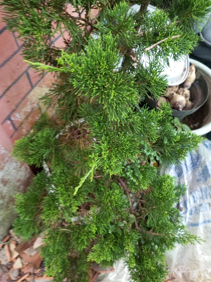 - "An overhead photograph displays a potted coniferous plant, characterized by dense, bright green, scale-like foliage, with some older brown growth visible deeper within the branches" by FM-KHihw2, licensed under CC BY 4.0