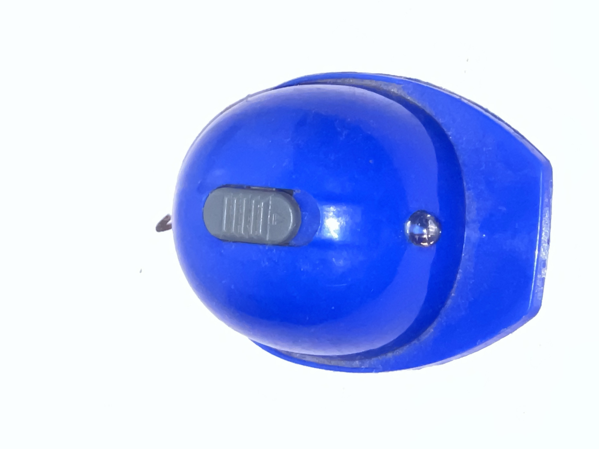 A blue plastic object, possibly a tape measure or similar tool, is shown against a white background. The object has a rounded, dome-like shape with a gray slide button on one side and a small, reflective dot on the other. A portion extends from the rounded section. The environment is not discernible, so a location in Abraka, Nigeria, cannot be confirmed or elaborated upon. There are no people or interactions depicted in the image.