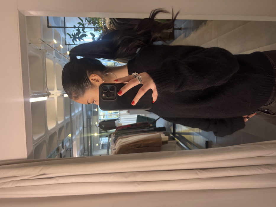 A female individual is depicted in a mirror selfie, captured from the chest up in profile, facing right. She has dark hair styled in a sleek, high ponytail with significant volume, and wears a black, textured long-sleeved sweater. A silver hoop earring is visible on her left ear. Her left hand, holding a dark-colored smartphone for the photograph, displays red nail polish and a prominent silver-toned ring on her index finger. The reflected background reveals the interior of a retail clothing store or boutique. Multiple clothing racks, laden with garments in various muted colors including beige, brown, and dark tones, are visible. The ceiling features square recessed panels and linear fluorescent light fixtures providing illumination. Green foliage from a plant is situated on the right side of the reflection. To the far left, a light-colored, possibly cream or beige, curtain hangs vertically. The floor appears to be a light, untextured surface. The scene is located within a retail clothing establishment in London, United Kingdom.