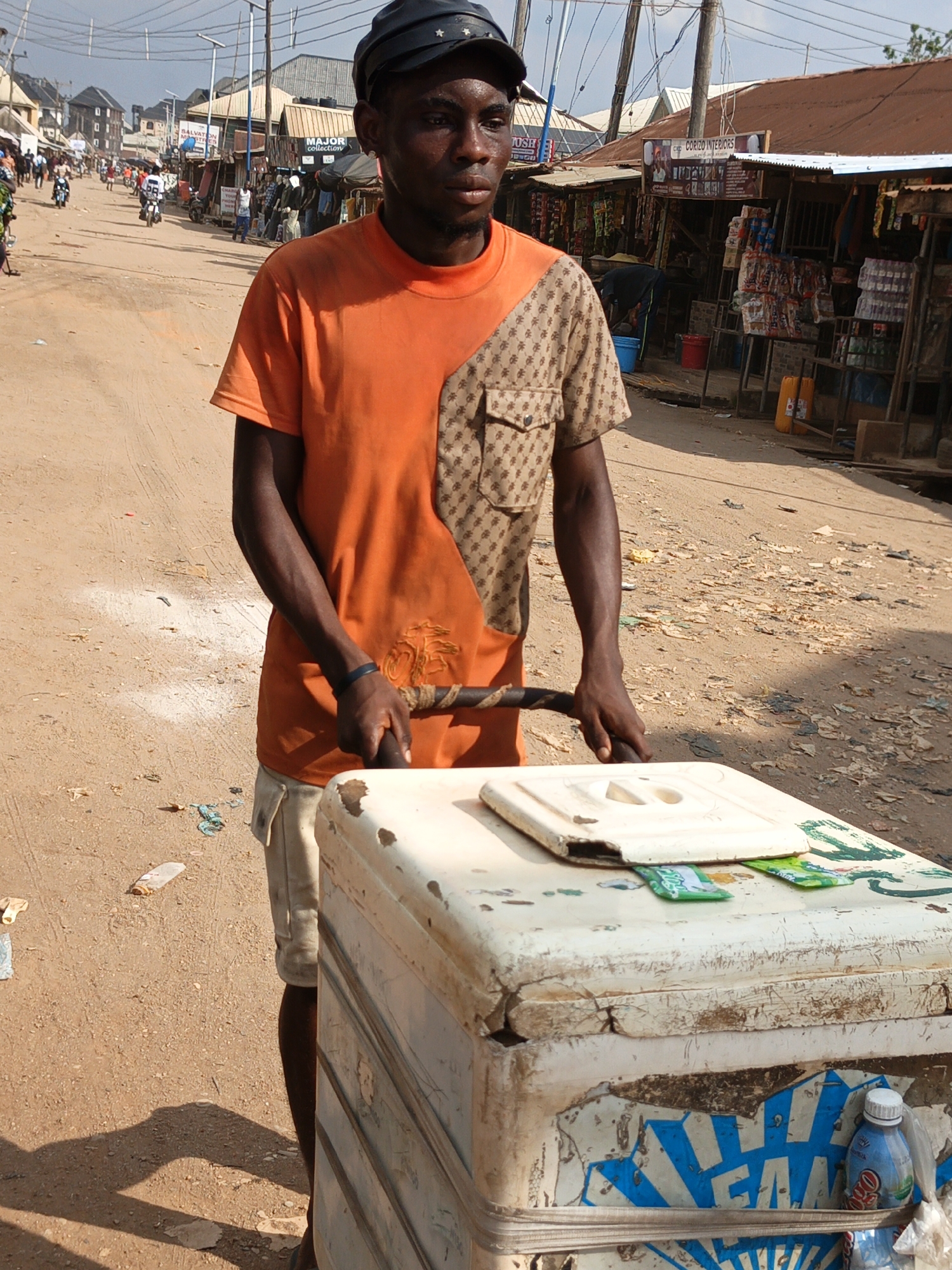 An adult male stands on an unpaved, dusty street in a market area of Unknown, Unknown. He is positioned behind a large, worn, white insulated cooler, holding its dark handle with both hands, indicating he is either stationary or pushing the cooler. The man wears a black cap, an orange short-sleeved t-shirt with a brown and beige patterned panel on the right front, and light-colored shorts. A dark wristband is visible on his left wrist. He has a dark complexion and short hair, looking slightly to his right. The cooler shows signs of wear, including cracks, dirt, and peeling stickers. Its top lid is partially open, with two small green packets resting on it. The front displays a large, peeling blue and white graphic and a clear plastic bottle with light blue liquid is secured by a strap or opening, next to a plastic bag. The background reveals a bustling street scene. On the left, pedestrians and at least two motorcycles are visible further down the road. Buildings line the street, some with signage like "SALVATION MARKET" and "MAJOR COLLECTION." Numerous power lines are strung overhead between wooden utility poles. On the right, a row of market stalls or small shops with corrugated metal roofs display various goods, including packaged items and bottles. One shop sign reads "CORIZO INTERIORS." The environment is brightly lit by natural sunlight, casting distinct shadows.