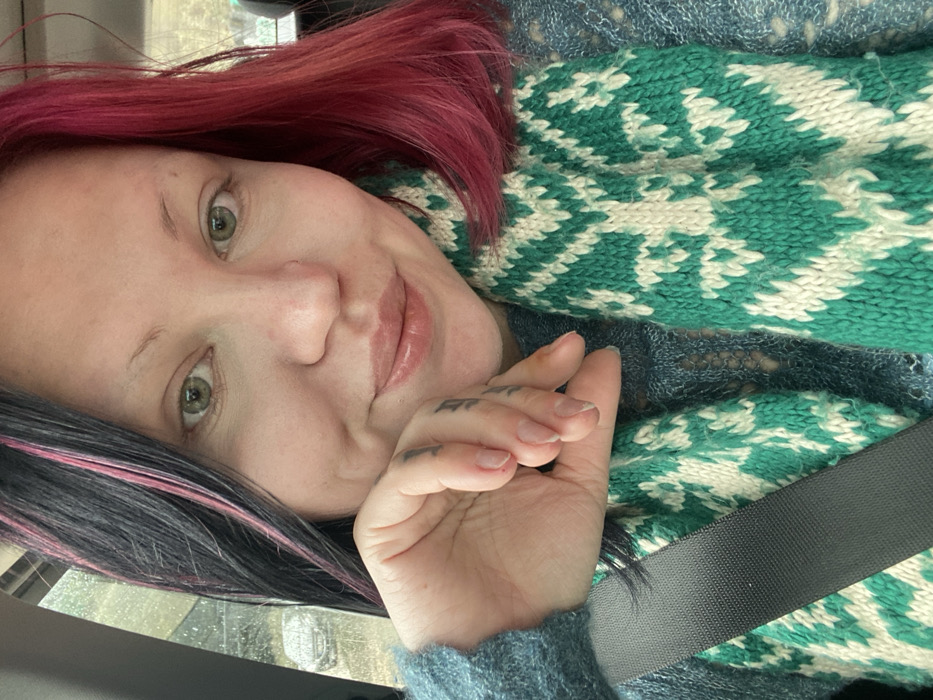 A close-up portrait depicts an individual, appearing female, inside a vehicle, located in Kruče - Kërruçi, Montenegro. The person has light skin, light green eyes, and a slight smile with glossy lips. Hair on the viewer's left is dark with pink streaks, while hair on the viewer's right is vibrant magenta. The individual wears a dark teal or blue knitted sweater with an open-weave pattern. A knitted scarf, featuring a geometric pattern in teal/green and off-white, is wrapped around the neck. A black seatbelt strap is visible across the individual's chest. Tattoos are present on the fingers of the left hand, which is positioned with fingers near the chin area. The background, blurred and seen through a vehicle window, suggests an outdoor scene, possibly overcast, with a very faint outline of what appears to be a parked car, potentially covered in snow or frost. The individual is looking directly at the camera.