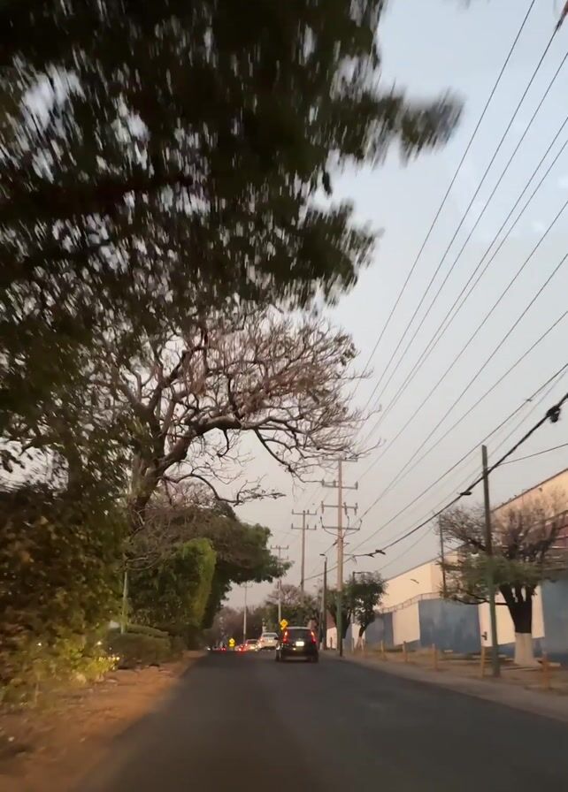 The view from the dashboard of a vehicle driving down a paved road lined with trees, bushes, and power lines. Several cars are visible ahead, including one dark-colored sedan. A large building with a blue wall stands to the right of the road. The sky is overcast.