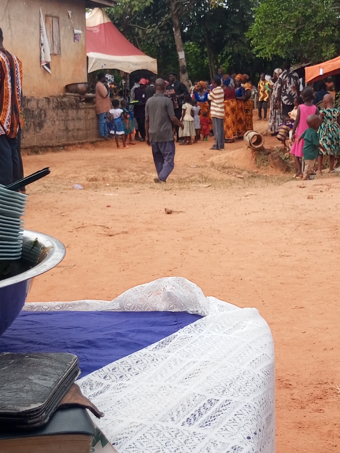 The scene depicts an outdoor gathering in the city of Unknown, Unknown, characterized by a reddish-brown unpaved ground. In the immediate foreground, a table covered with a dark blue cloth and a white lace overlay holds a stack of dark-bound books, a large metallic bowl containing green material, and a stack of light-colored plates with a black utensil. A man in a dark grey shirt and blue trousers walks away from the viewer in the midground. The background features approximately 20-30 individuals, comprising adults and children, standing in various groups. Adults are predominantly dressed in vibrant, patterned clothing. Structures include a light-colored building with a small window on the left, an adjacent red and white striped tent, and an orange tent on the far right. Dense green foliage and trees form the backdrop, and a cylindrical object lies on the ground in the mid-right.