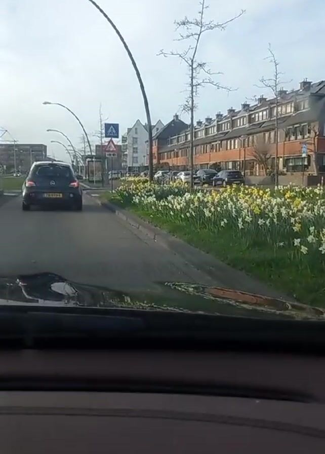 view from inside a car driving on a road in a residential area. On the right side of the road is a grass strip filled with blooming daffodils. Row houses line the street beyond the flowers. On the left are more houses and some street lights. The car in front has license plates with "28-TVP-9". There is a pedestrian crossing with signs. The sky is bright and there are thin branches of trees visible.
