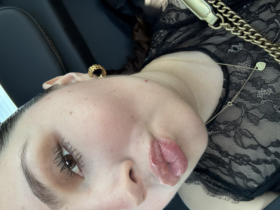 A close-up selfie focuses on a fair-skinned woman. Her face is slightly tilted. She has brown eyes, full lips with glossy lipstick, and arched eyebrows. A gold earring adorns her ear, and a delicate gold necklace with a heart pendant is visible against a black lace top. A gold chain bag strap crosses her chest. The background features a dark, textured surface, likely a car seat.