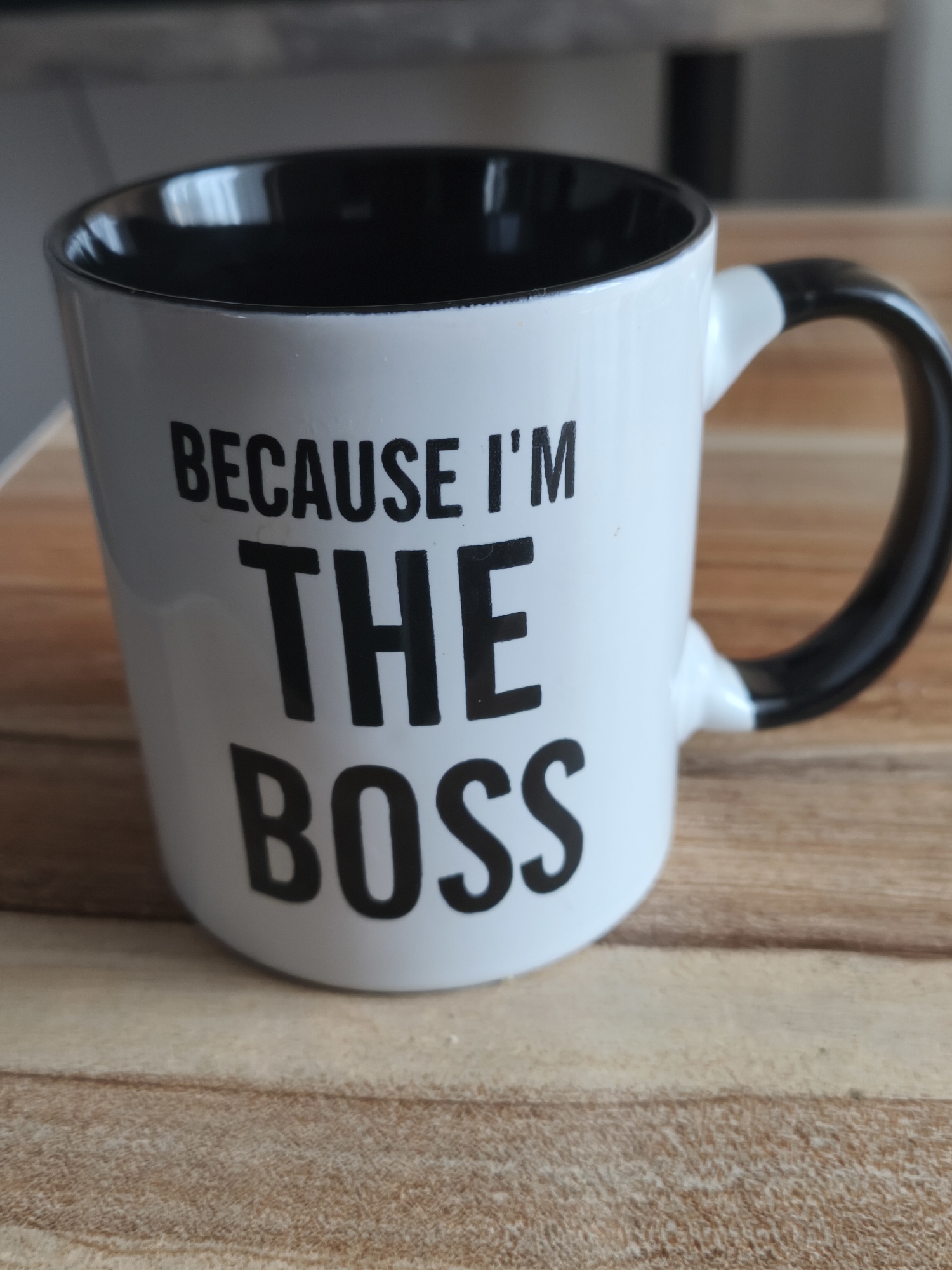 A white coffee mug with black interior and handle sits on a light brown wooden surface. The mug reads "BECAUSE I'M THE BOSS" in black capital letters. The location is not discernible from the image.