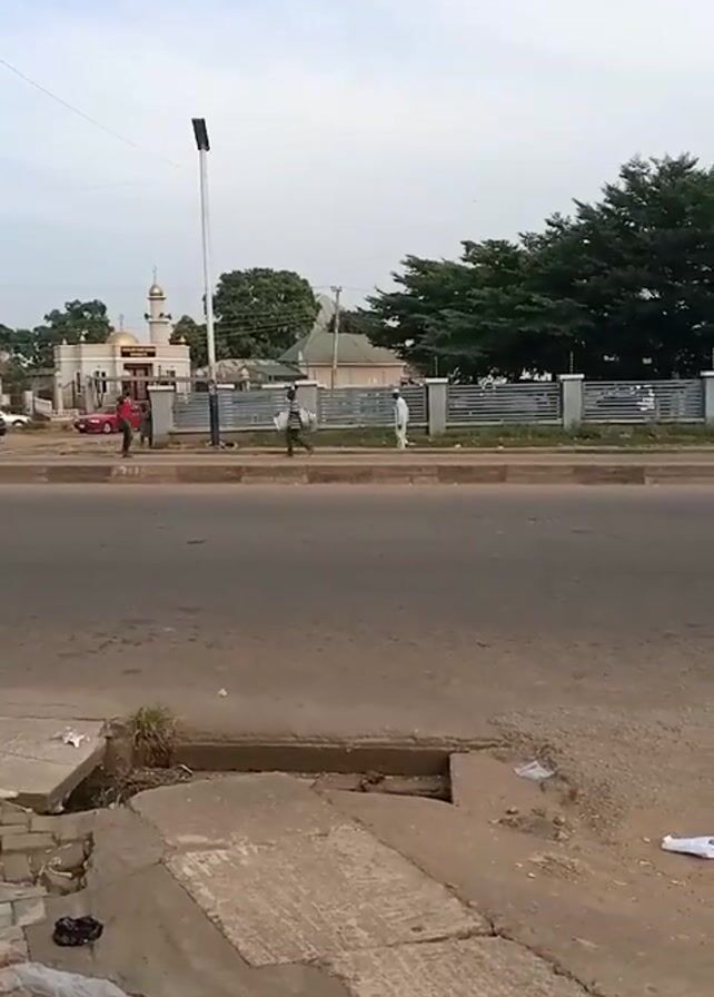 The video depicts a street scene, likely in an urban area. A moderately wide asphalt road runs horizontally across the frame. On the left, there is a mosque with a golden dome and minaret. Several people are walking on the sidewalk. To the right of the mosque, a building with light-colored walls is visible, surrounded by a fence and tall, cone-shaped trees. A few vehicles, including a yellow tricycle, pass along the road. In the foreground, there is a concrete curb and a drainage ditch, with some debris scattered around. The sky is overcast, suggesting a relatively muted light level.