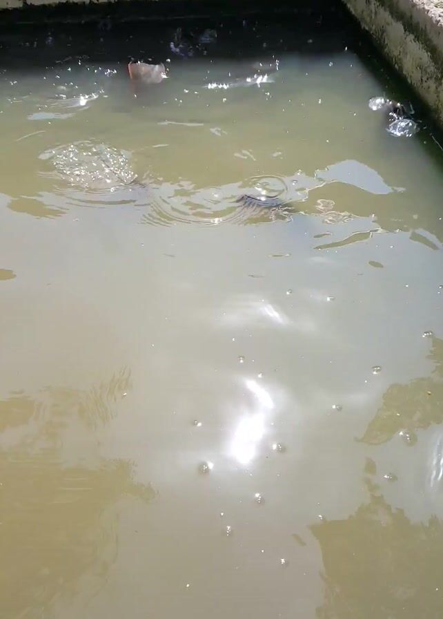 The camera is positioned above a murky, shallow pool of water contained within a concrete structure. Ripples disturb the water's surface, reflecting sunlight. Several fish, including what appears to be a catfish due to its visible barbels, are seen swimming within the pool. A white pipe is submerged in the water, releasing a stream of water. The pool's edge shows some algae growth.
