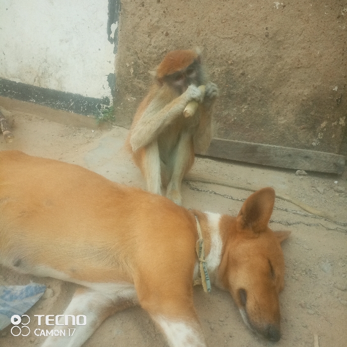 A brown dog with a white neck lies sleeping on the ground. Behind the dog, a monkey sits upright, holding and eating a cylindrical object, possibly a banana. The setting is outdoors, near a wall that shows signs of aging and wear. A bit of blue fabric lies beside the dog.
