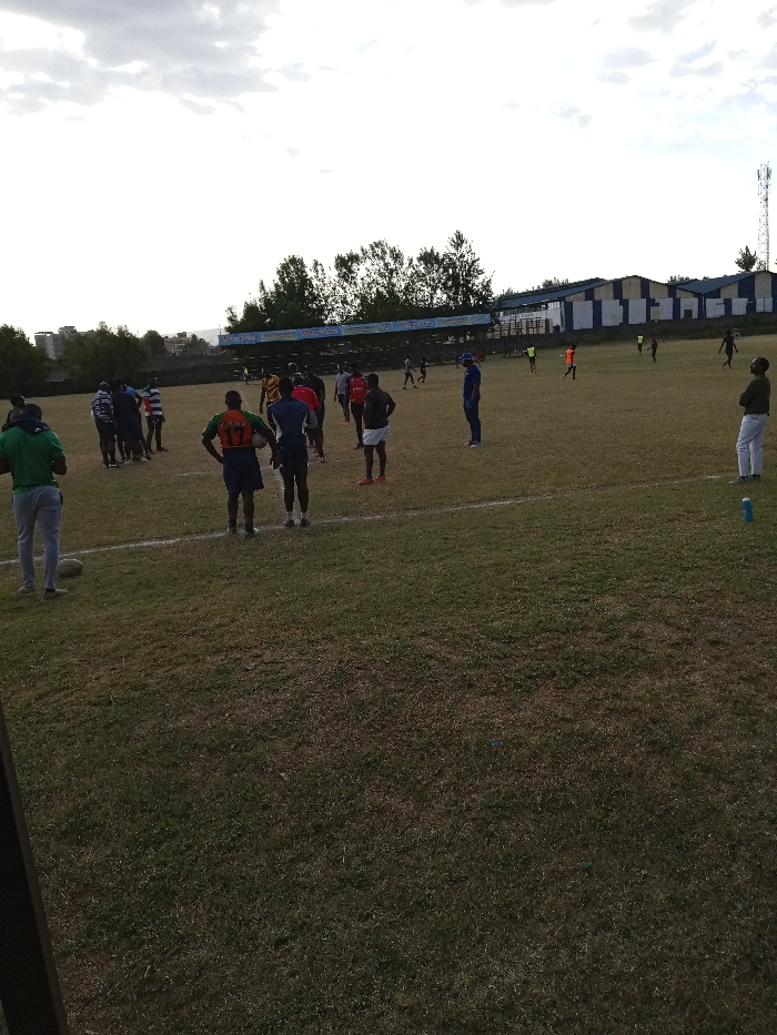 An outdoor scene depicts a grassy field with a group of people, likely a sports team, gathered. Some individuals are standing and observing, while others appear to be practicing or warming up. In the background, there is a small stadium-like structure with seating and a building. A communication tower is visible in the distance. The sky is overcast, suggesting it is either late afternoon or early morning.