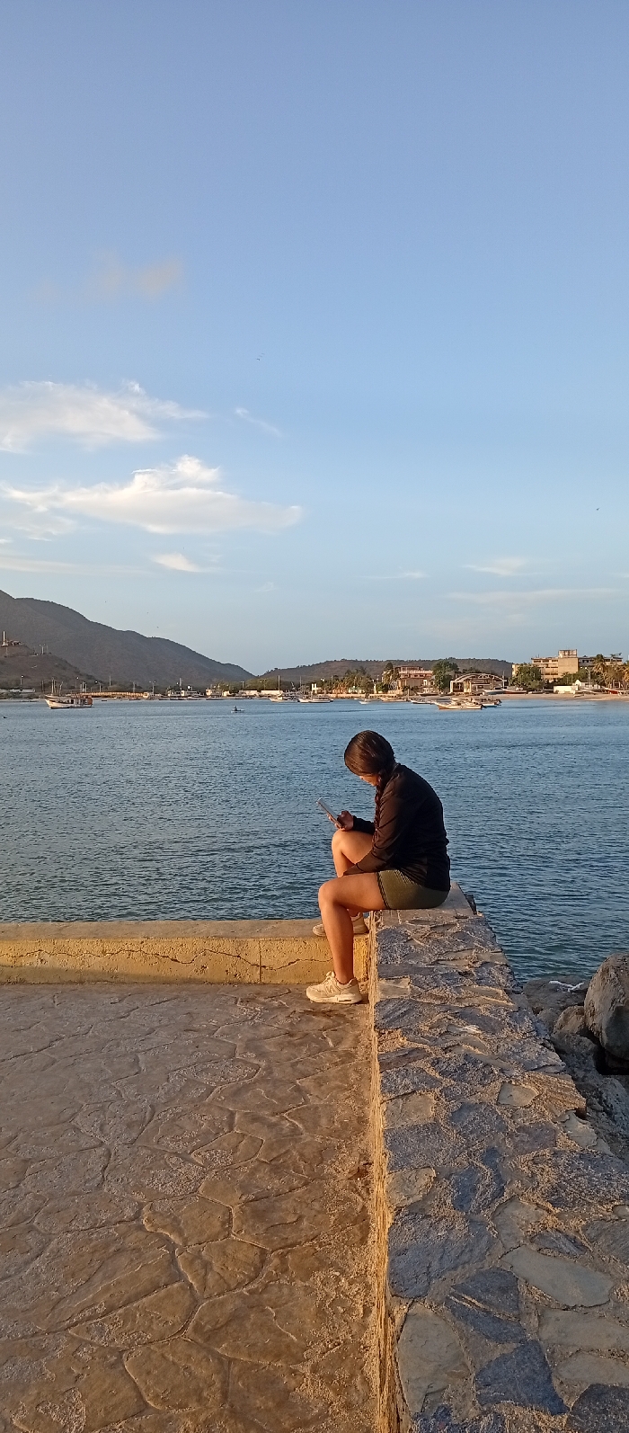 The image displays a solitary individual seated on a stone retaining wall at a waterfront in Juan Griego, Venezuela. The person, an adult female with short dark hair, is positioned in the lower right quadrant, oriented to the right, and focused downward on a light-colored electronic device held in both hands. She wears a long-sleeved dark top, dark green shorts, and light-colored athletic shoes. Her feet are placed on a lower section of the wall. The retaining wall consists of a smooth, light tan concrete top surface where the individual is seated, and a lower section composed of irregular grey and tan stone blocks. Adjacent to the wall is a patterned, light brown paved surface. Warm, golden sunlight illuminates the foreground and the individual, suggesting late afternoon or early evening. Beyond the wall lies a calm bay, with numerous small to medium-sized boats anchored or moored across the water. These include several small fishing boats, a larger traditional wooden boat with visible masts on the left, and a single person on a small watercraft in the mid-distance. The background features a range of hills or mountains rising on the left, transitioning to the developed coastline of Juan Griego on the right, where various buildings and structures are visible along the shore. The sky is predominantly clear blue with scattered white, wispy clouds. Several small, dark avian figures are discernible in the upper sky.