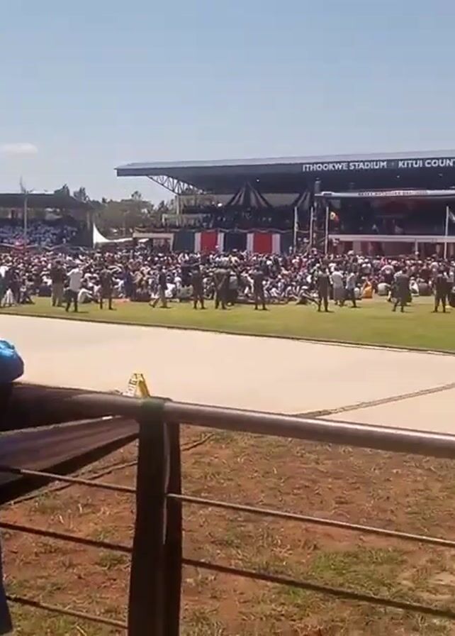 large crowd gathered at Ithookwe Stadium in Kitui County. People are standing and sitting in the stadium, with uniformed personnel present. The camera moves around to show different sections of the crowd. Some people are standing near a railing overlooking the field. There's a flag present and the video ends.