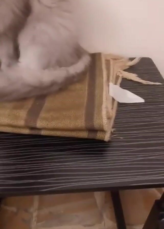 A medium shot shows a grey, fluffy cat sitting on a square, gold and brown striped cushion
