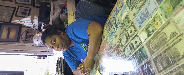 This image depicts an adult female seated at a table within an indoor commercial or office setting in Cutler Bay, United States of America. The woman, with dark skin and dark hair pulled back, occupies the center-right of the frame, looking directly towards the viewer with a neutral expression. She is seated in a dark chair and wears a short-sleeved blue t-shirt with a yellow logo partially visible on the left chest. Her fingernails are painted yellow, and she has a ring on her right ring finger. Her forearms rest on the table, with her right hand holding a yellow object, possibly a pen or highlighter. The table surface is covered by a clear protective layer, beneath which numerous international banknotes are displayed. These include US Dollar bills (e.g., $1, $5), a Polish 50 Zloty note, and Cuban 10 Pesos notes, among others. A yellow sticky note is visible on the table near her left hand. The background, largely behind the woman, features a brightly lit window or doorway on the left, causing some overexposure. To the left of the window, dark stacked items are visible. The wall behind the woman is adorned with various objects: a framed picture depicting a sunset or sunrise scene, a circular "CHAMPIONS" sign with a bee graphic, and a decorative sailboat model with blue and white striped sails. A black printer/scanner unit sits on a surface to the right, surrounded by other miscellaneous items including small toys (e.g., a blue truck), white containers, and plastic bags. Another framed picture containing multiple figures is partially visible to the far right. A yellow sticky note is also present on a surface to the right of the woman's head.