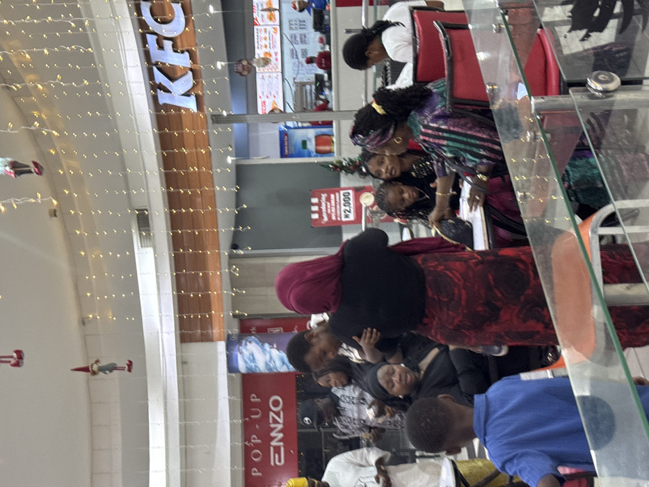 A group of people gathers inside a mall. Several women in colorful attire stand near a KFC restaurant. String lights decorate the ceiling above. A pop-up Enzo advertisement is visible in the background. Patrons are seated on red chairs while others stand nearby. A young boy in a blue shirt is present, adding to the mix of individuals in the scene.