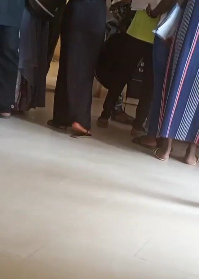 group of about a dozen people standing in line inside a building. The floor is tiled and shiny. The people are dressed in casual clothing, including jeans, t-shirts, dresses, and head coverings. Some are holding papers. In the background is a sign that reads "POLYTECHNIC CONSULTANCY SERVICES LIMITED." A banner is also visible, but the text on it is unclear. The camera is held at a low angle and moves slightly.