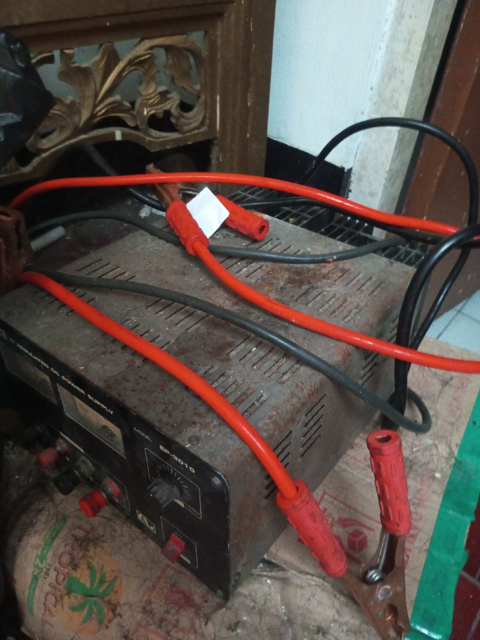 A slightly rusted and dirty power supply sits on top of a white bag. It is connected with black and red electrical leads. There are battery-type clips on the end of the red electrical leads. One set of clips are open and have red plastic grips. A white rectangle is taped to one of the red electrical leads. The power supply has a black face with multiple buttons and a dial. A wooden cabinet with an ornate carved design is behind the power supply.