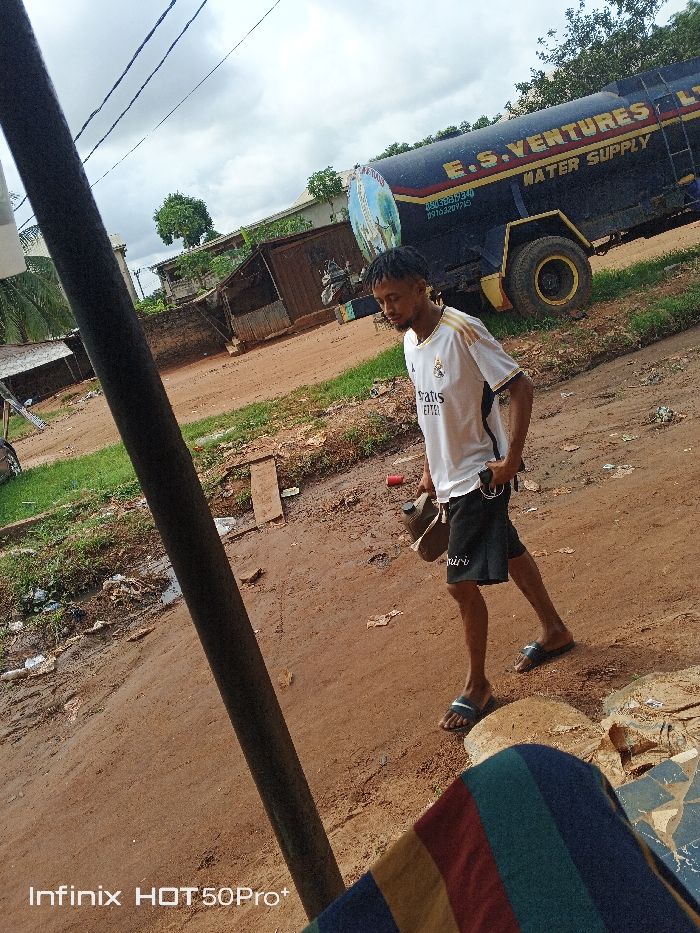 The image depicts an outdoor scene in Ogidi, Nigeria, under an overcast sky