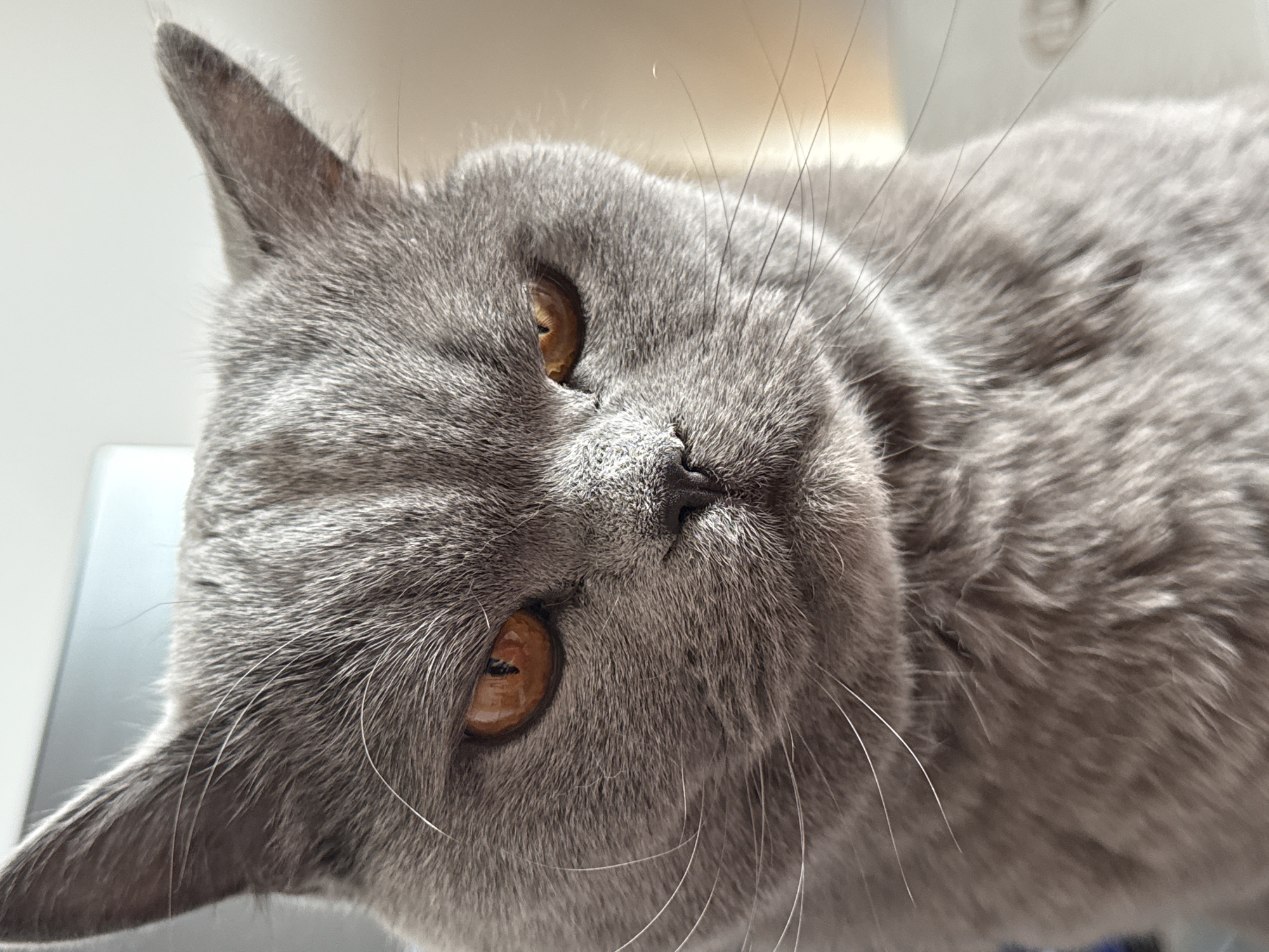 - "A close-up, frontal portrait of a domestic feline is presented, depicting a British Shorthair cat with dense, solid blue-grey fur" by FM-MzOAu2, licensed under CC BY 4.0