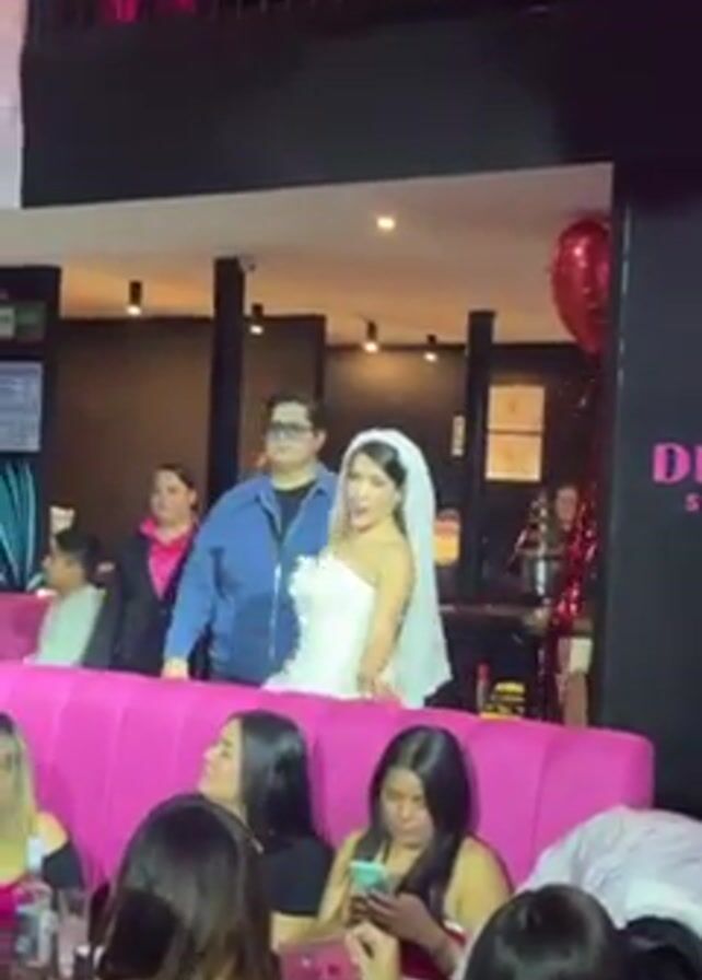 Here's a concise description of the video: The video shows a woman dressed in a short, white dress and a veil, likely for a bachelorette party, standing on a pink couch in what appears to be a restaurant or club
