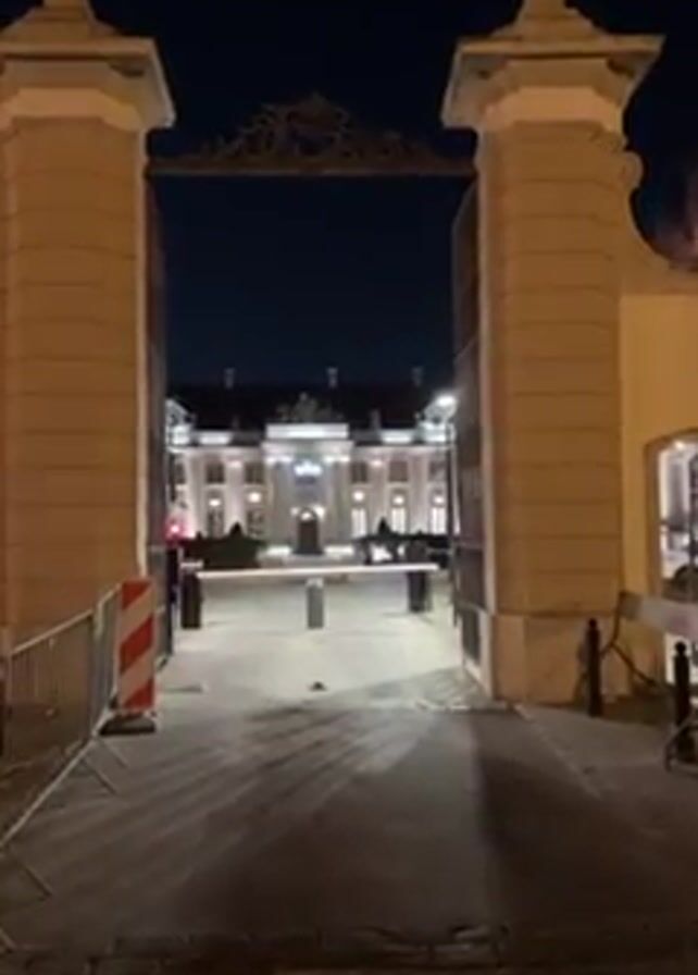 The camera slowly zooms through an ornate gate toward a large building. The building is white with multiple windows, columns, and decorative elements on the roof. The words "La Verie" are lit up in bright blue above the building's entrance. Two barriers are in front of the building's entrance. It is nighttime, and the building and gate are illuminated by lights.