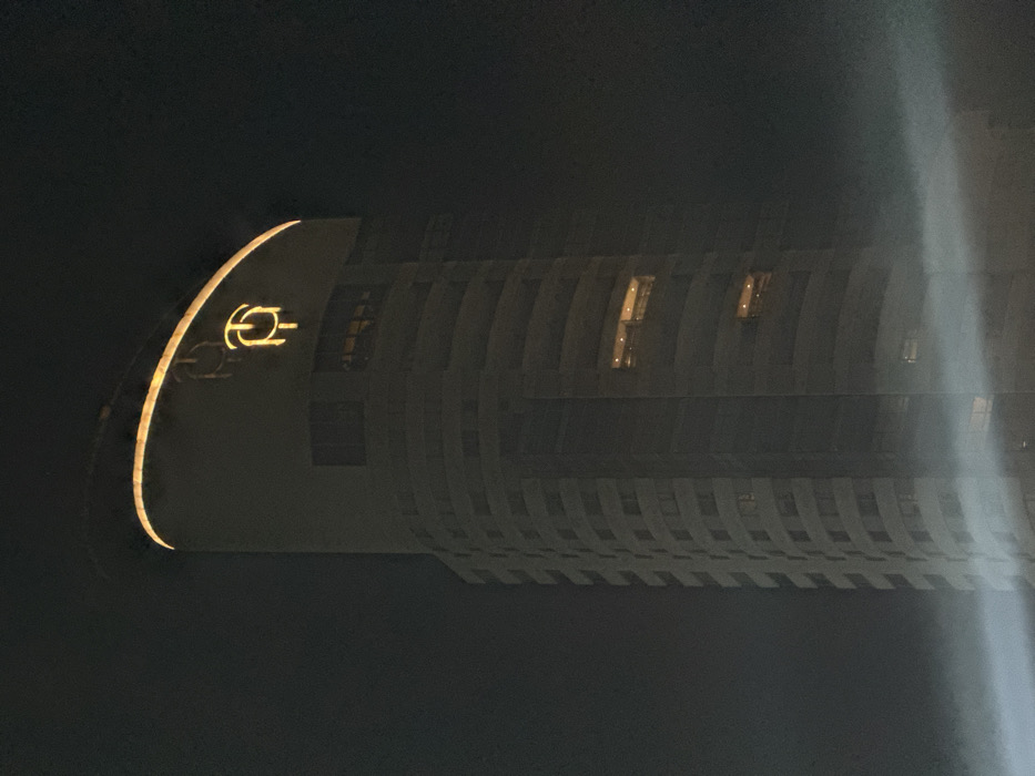 A dimly lit, high-rise building dominates the frame against a dark night sky. The structure features a curved design, with evenly spaced windows and recessed balconies. A gold-lit logo adorns the top of the building's rounded edge. Vertical bands of light streak through the right side of the image, creating a hazy effect. The overall composition is shrouded in shadow, emphasizing the building's illuminated details.