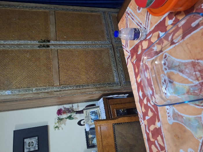 An image shows a table covered in an orange-patterned tablecloth with a clear baking dish, a water bottle, and stacked orange bowls. Behind the table is a large, ornate wooden cabinet with woven panels. Below the cabinet, a wall holds a framed picture, a flower arrangement in a vase, and other framed photos atop a smaller wooden cabinet.