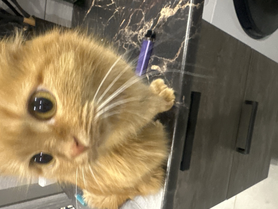 An orange cat stares with wide, dilated pupils. A purple vape pen rests on a dark countertop next to the cat's paw. The countertop features a swirling marble pattern. In the background, gray cabinets with black handles are visible. The image is shot from above, offering a close-up view of the cat.