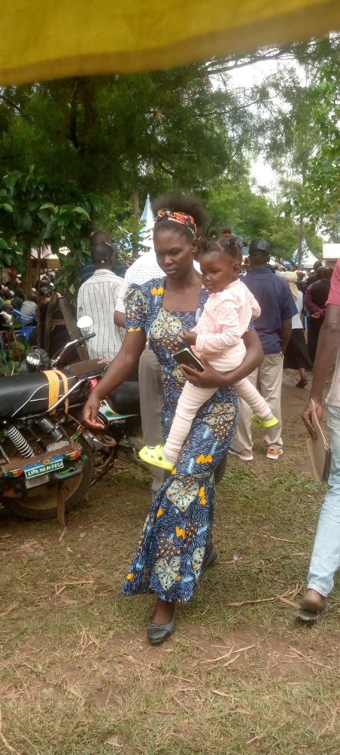 A woman in a blue and yellow floral dress is holding a young girl in a pink dress in her arms. The woman is standing in a grassy area, next to a motorcycle. She is walking towards the right side of the frame. The young girl is looking towards the left side of the frame. The woman is holding a cell phone in her right hand. The woman is wearing black shoes. The young girl is wearing green sandals. The background shows other people, trees, and a building. The scene is likely near the coordinates provided, which are located in Burundu, Kenya. There is a motorcycle parked in the foreground. The woman and child are walking in the grass.