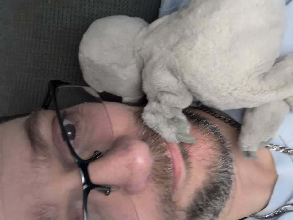 A close-up shot reveals a man lying on his back, wearing black-rimmed glasses. A plush, light-colored dinosaur toy rests on his face, with its feet near his mouth. The man has short, salt-and-pepper stubble. A silver chain is visible around his neck. The man's eye is partially obscured by the glasses' frame, and the background is slightly blurred, focusing attention on the man and the toy.