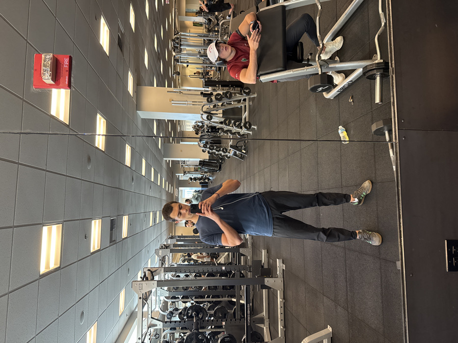 The image depicts the interior of a fitness center, specifically the Boston University John Hancock / Fitness & Recreation Center (FitRec) in Boston, Massachusetts, United States. A male individual, approximately 20-30 years old, with short brown hair, stands centrally, taking a mirror selfie with a dark-colored smartphone held at chest height. He wears a dark blue t-shirt, dark athletic pants, and grey and green sneakers, with white wired earbuds visible. His reflection is the primary subject. To the right, another male individual, also approximately 20-30 years old, is seated on a Precor preacher curl machine. He wears a maroon long-sleeved shirt, a white Callaway cap, and large over-ear headphones, holding a small dark object (possibly a phone or remote) in his hands, facing left. A yellow plastic water bottle lies on the dark grey rubberized floor near him, along with a barbell and weights. The gym features a vast open layout with a grid ceiling system comprising white acoustic tiles and numerous rectangular fluorescent light fixtures. A red Simplex fire alarm horn/strobe is mounted on the ceiling in the upper right quadrant of the image. Various types of gym equipment are visible, including multiple Hammer Strength weight racks with numerous weight plates, dumbbell racks, and other exercise machines, indicating a well-equipped facility. The floor is covered with dark grey interlocking rubber mats. Other indistinct figures are visible in the background, utilizing equipment further into the gym.