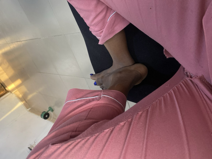 person wearing pink pajamas. The pajamas have white trim. A bare foot with blue nail polish is visible. The foot rests on a black surface. The pajamas appear to be torn or frayed in some areas. The background includes a reflective surface and a green object.