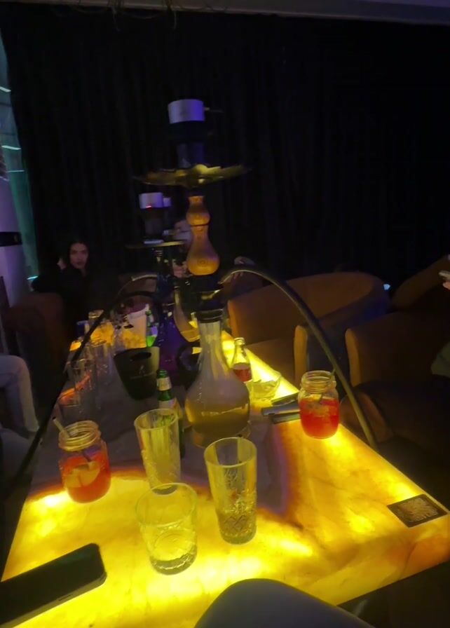 The video begins with a close-up of a yellow-lit table covered with a hookah, glasses, a bottle, and mason jars filled with a red liquid. The table is surrounded by people sitting on brown chairs. A woman with dark hair is visible in the background, looking at her phone. The camera then pans up to reveal a nightclub atmosphere with blue lighting, a patterned ceiling, a stage, and people at other tables. The overall impression is a lively, social setting, probably a bar or club, where people are enjoying drinks and hookah.