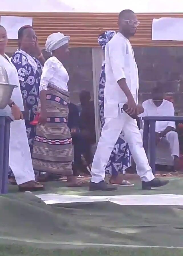 gathering outdoors, possibly a religious event or a celebration. Several people are walking around, many wearing white attire, which suggests a formal or ceremonial occasion. A large metal bowl is placed on a blue table, and people seem to be interacting with it, possibly partaking in a ritual or serving themselves. The setting appears to be on a grassy area with a temporary shelter in the background.