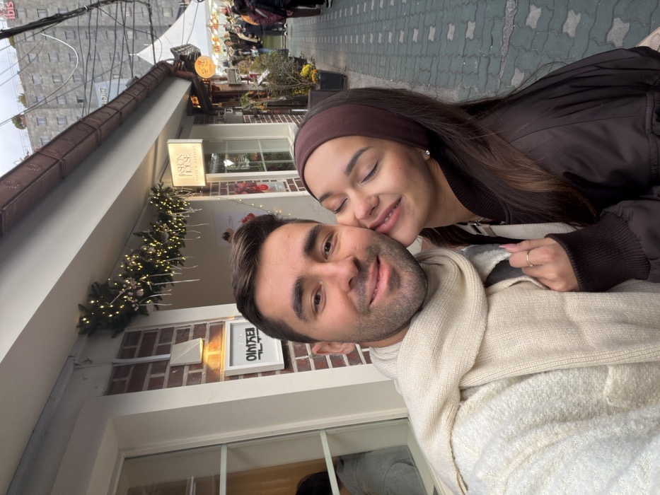 A couple smiles for a selfie in front of a brick building with decorated windows and signage. The woman wears a brown jacket and headband, her eyes closed as she leans against the man. He wears a white sweater and scarf. The building behind them features festive garland and lights above windows. A street scene with people and market stalls appears blurred in the background. The angle of the photo is rotated, creating a tilted perspective.