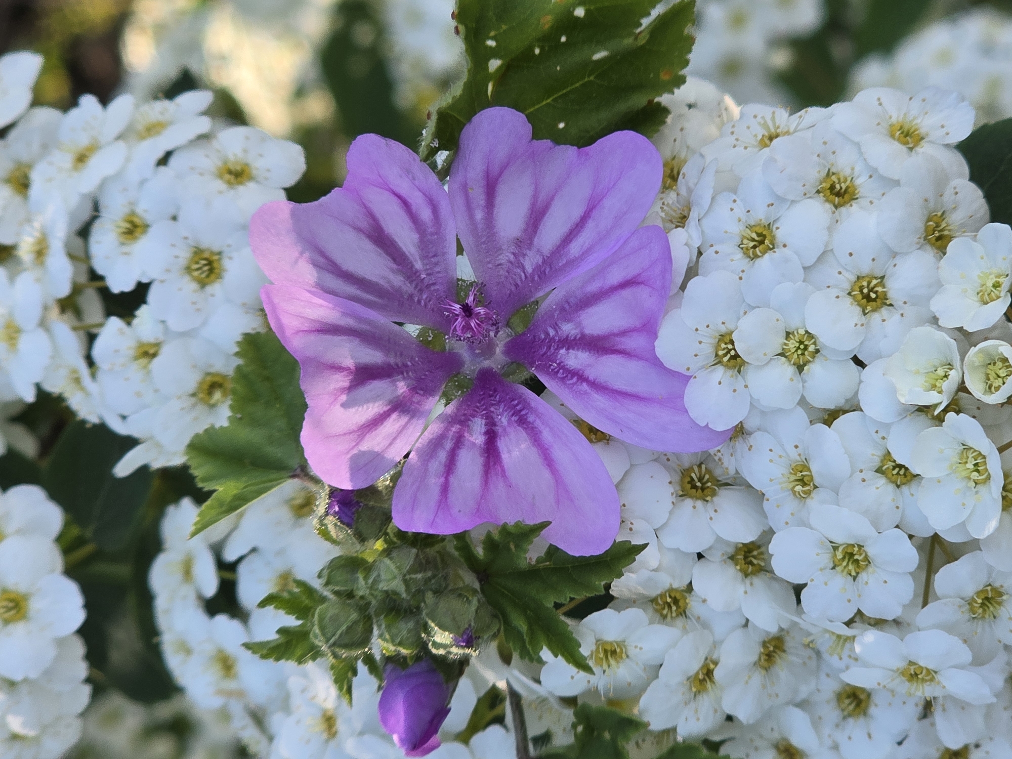 A close-up shot captures a cluster of white flowers with yellow centers, possibly spirea, surrounded by green leaves. A singular, purple-striped mallow flower is centrally positioned among the white flowers. The scene appears to be in natural daylight, and its location is not specified.