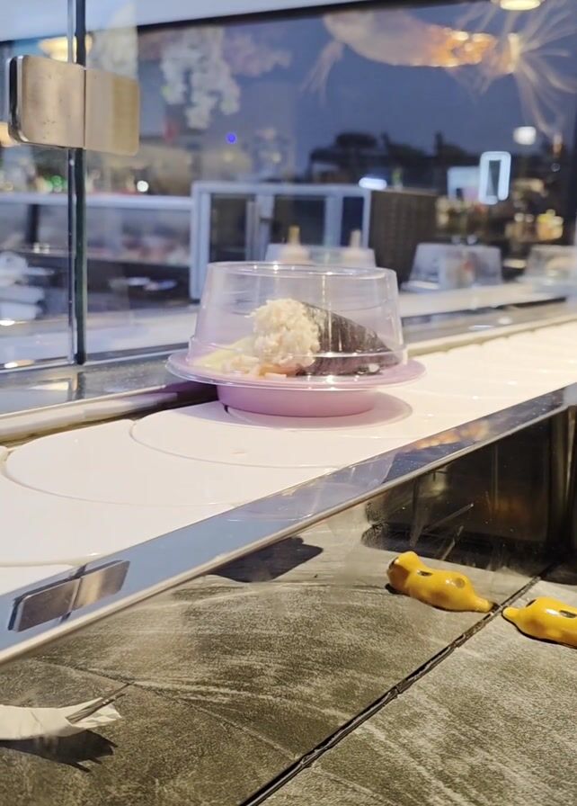 piece of sushi moving along a conveyor belt in a restaurant