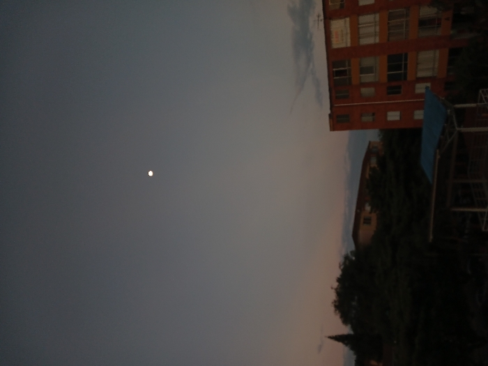 The image depicts a dusky sky with a bright moon prominently visible. A tall red brick building stands on the right, featuring multiple windows and a light-colored advertisement banner. Next to the building is a covered structure with a blue roof. Below these structures, lush greenery merges into the fading light, suggesting trees and foliage. The sky transitions from a darker shade at the top to a lighter, pinkish hue near the horizon.