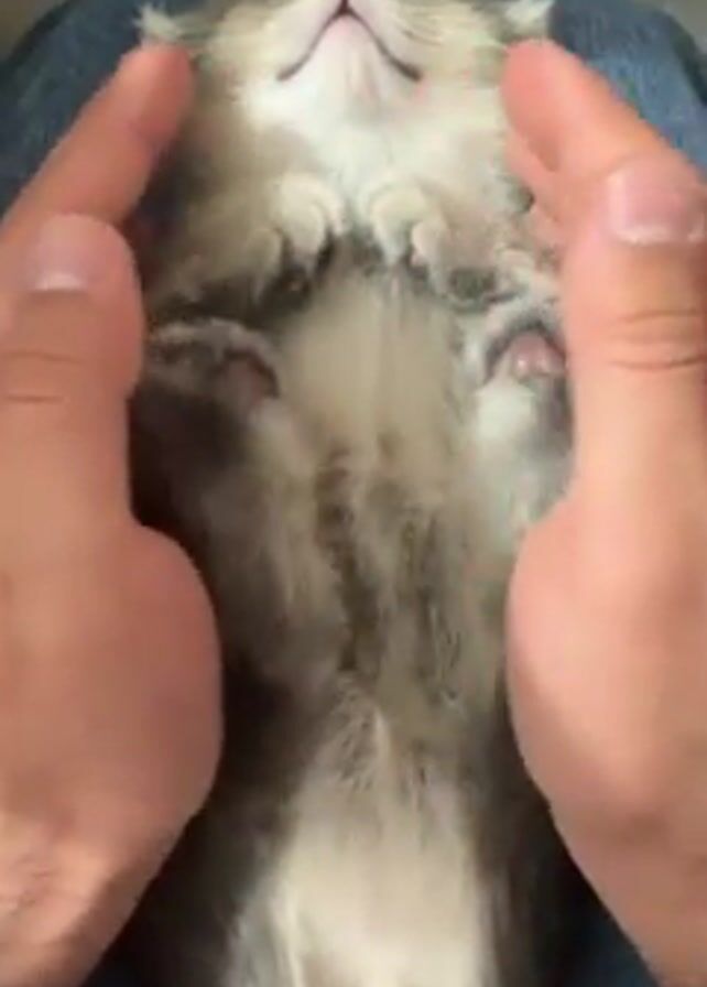 A man is shown holding a kitten on his lap. The kitten is lying on its back, with its paws facing upward. The man's hands are around the kitten, and he appears to be petting it. The kitten is gray and white, and its eyes are closed. The man is wearing blue jeans. The background is a light gray wall.
