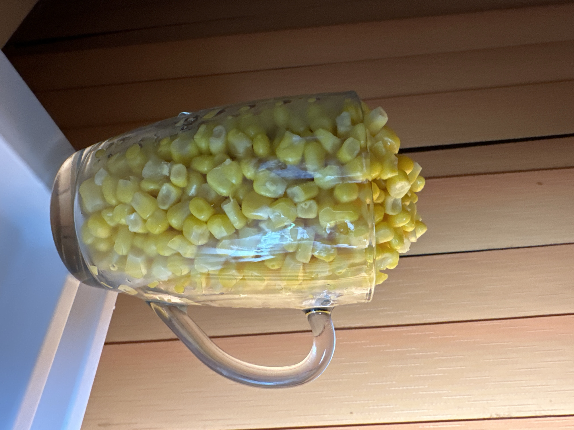 A clear glass mug, resembling a beer stein with a visible handle on the right, is filled to overflowing with pale yellow corn kernels